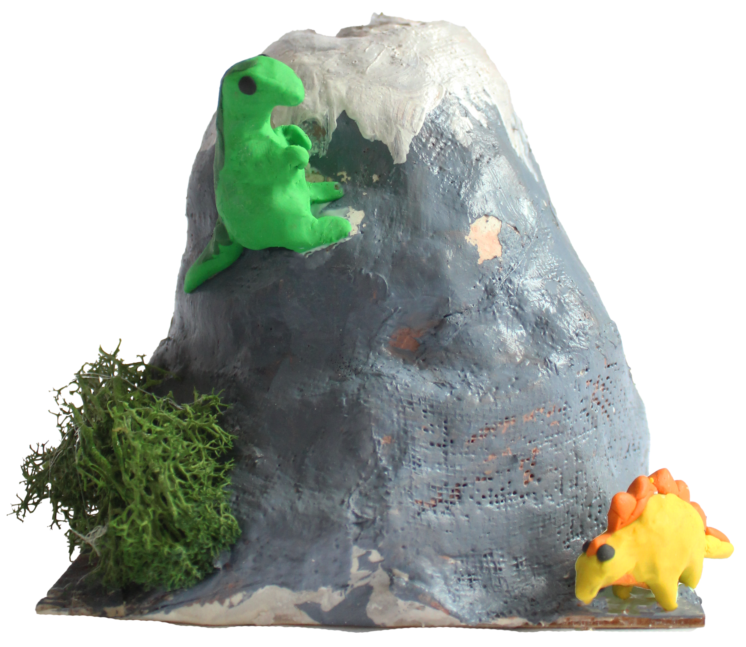 Erupting volcano with plaster strips, paint + modeling clay dinosaurs.