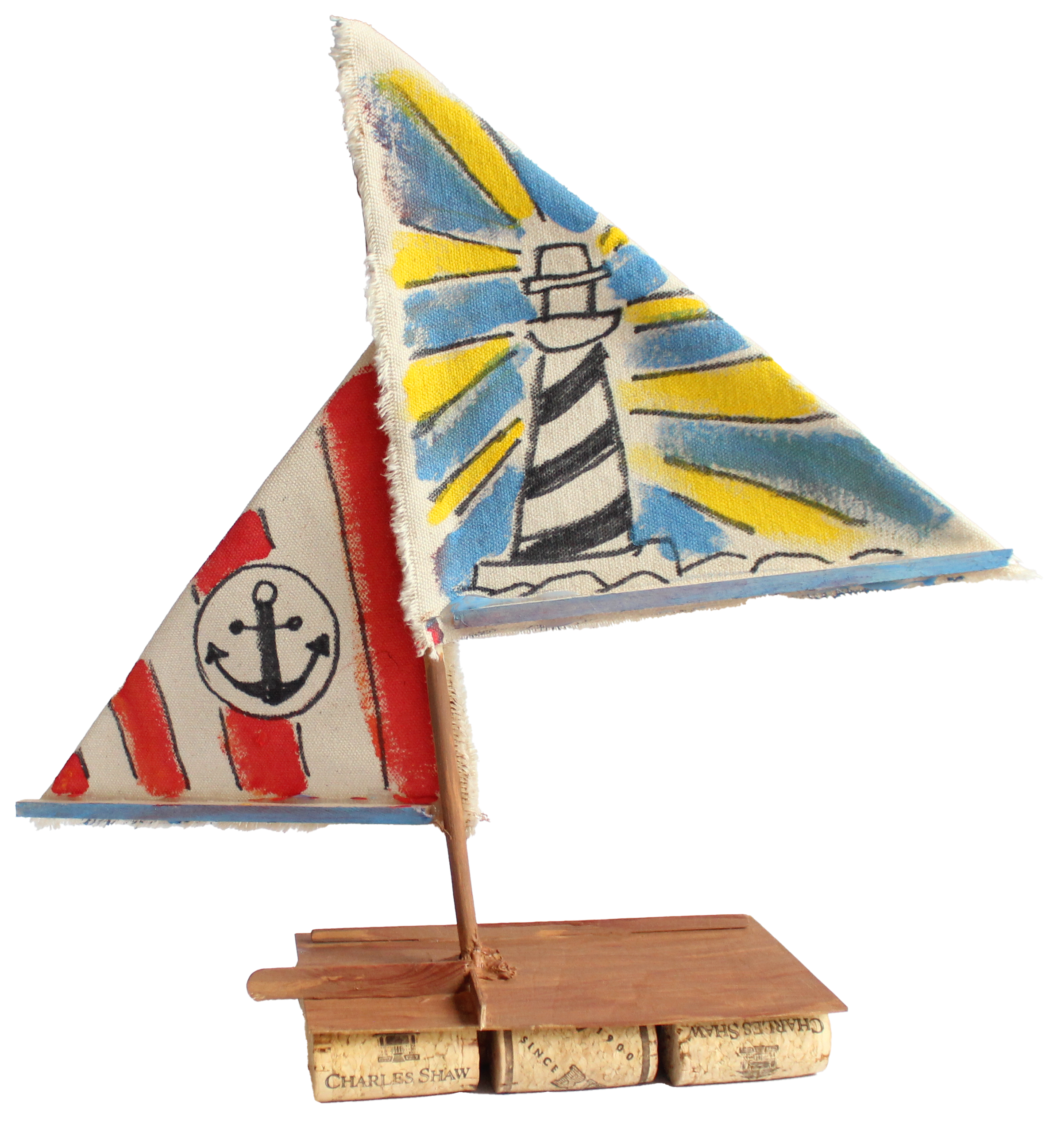 Sailboat using hot glue, found materials + paint. We will spend some time designing our sail. Recommended for ages 6-10.
